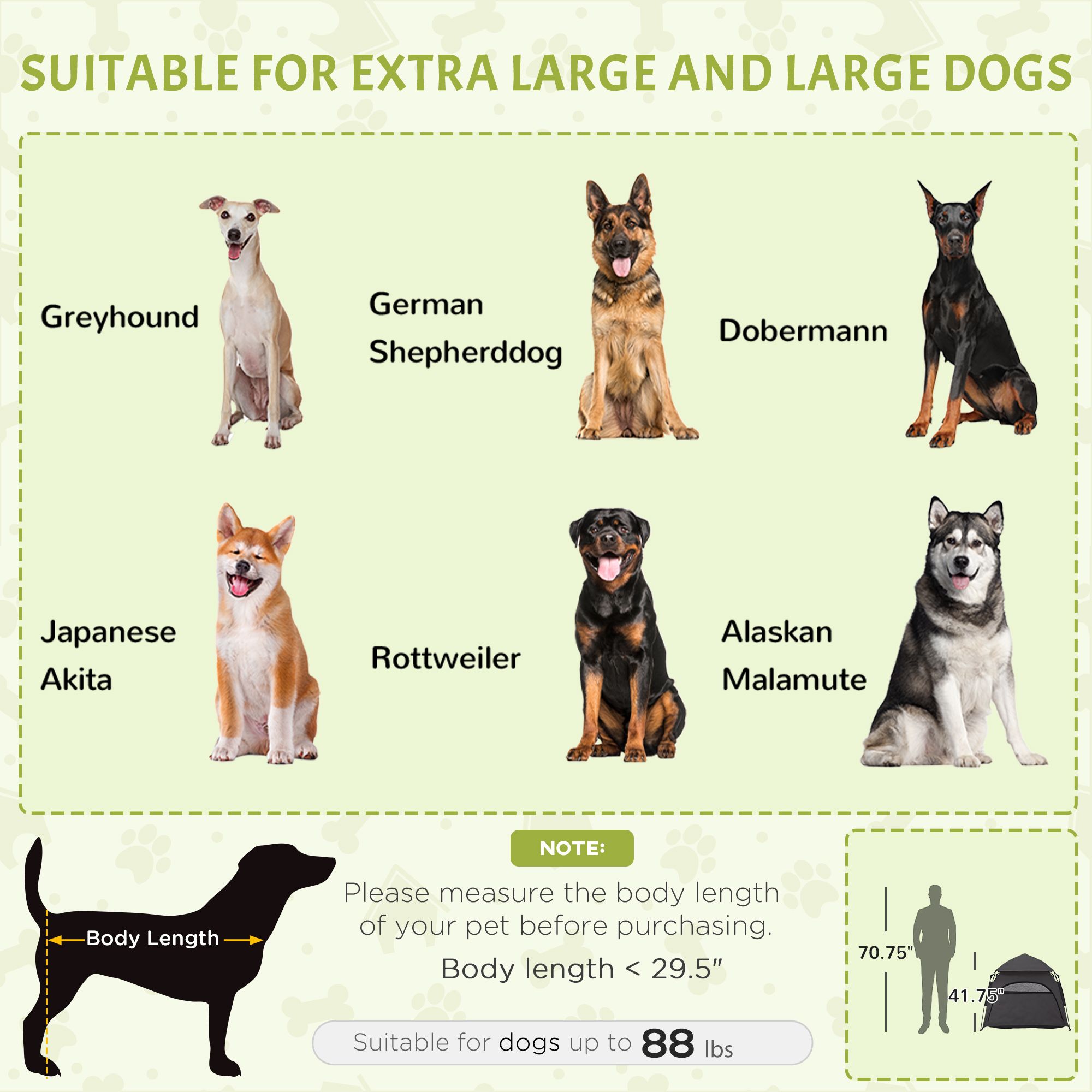 • - Spacious Pet Tent: With interior dimensions of 43.25" L x 43.25" W x 33.5" H, our pet tent is suitable for extra large and large dogs less than 29.5" in length and less than 88 lbs. in weight.